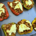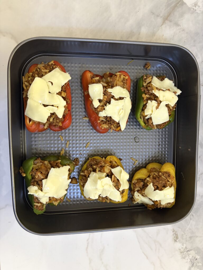 • Stuff the peppers: Arrange the peppers upright in a baking dish. Fill each pepper with the meat and rice mixture and top with cheese.