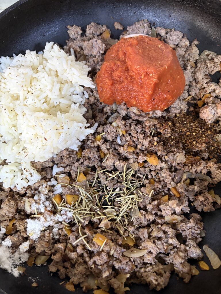 Heat some oil in a pan over medium heat. Add the chopped onion and cook for 2–3 minutes until soft. Add garlic and cook for 30 seconds. Then, your chopped carrots or vegetable of choice. Add the ground meat, cook until browned, breaking it apart as it cooks. Season with salt, black pepper, paprika, and dried thyme. Stir in the cooked rice and tomato sauce. Add some water if needed. Let everything simmer for 5–7 minutes until slightly thickened and well combined. Add half of your cheese.